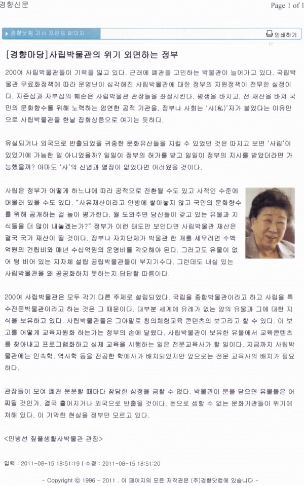 [경향신문] 인병선 짚풀생활사박물관장-사립박물관의 위기 외면하는 정부