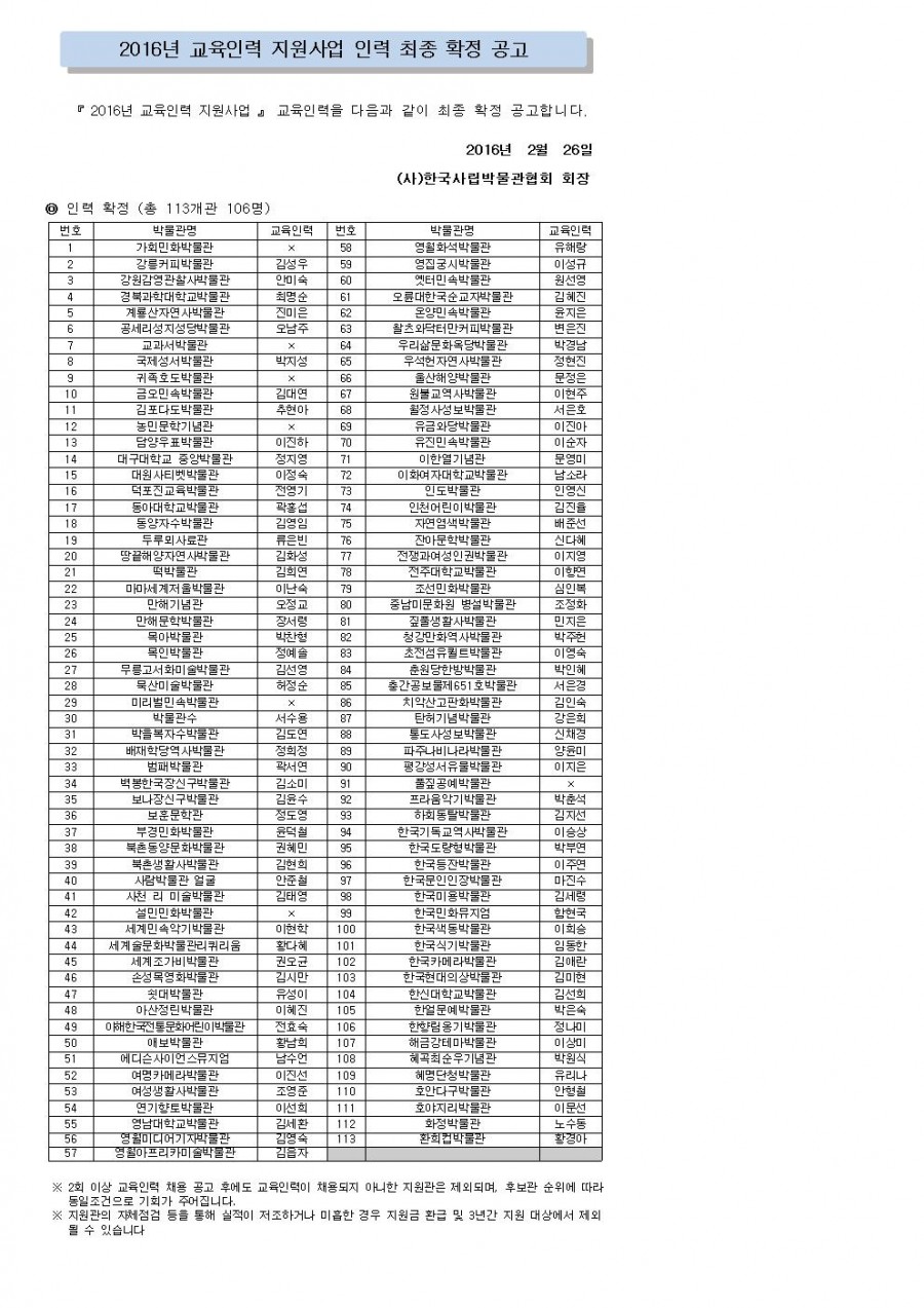 2016년 교육인력 지원사업 인력 최종 확정 공고 페이지 정보 작성자 관리자 작성일16-02-26 19:54 조회43,029회 댓글0건 관련링크 이전글 다음글 목록 본문 댓글목록 등록된 댓글이 없습니다. 이전글 다음글 목록