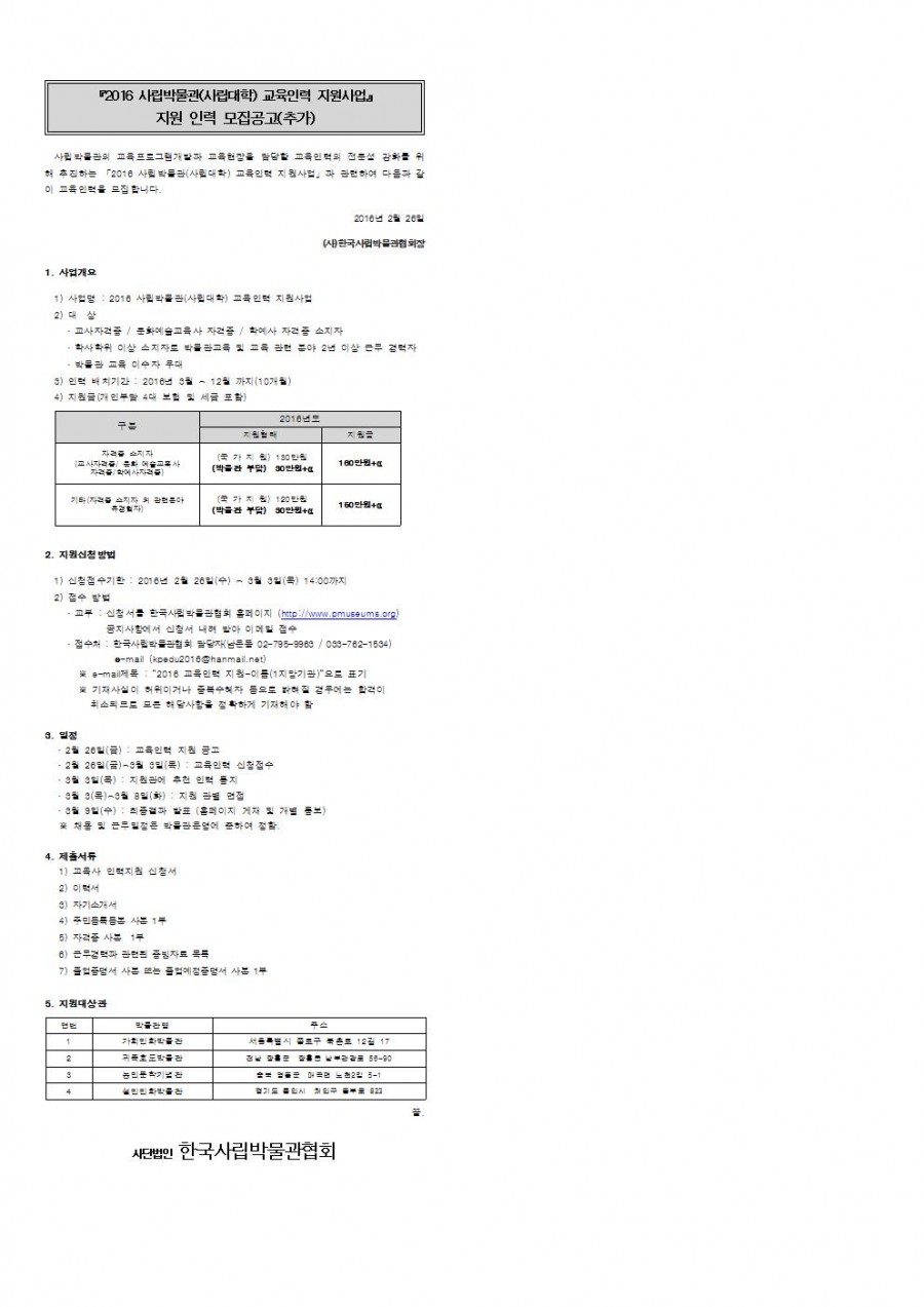2016 사립박물관(사립대학) 교육인력 지원사업 지원인력 모집 공고