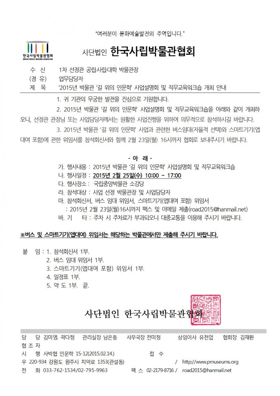 2015 박물관 ‘길 위의 인문학’ 사업설명회 및 직무교육워크숍 개최 안내 페이지 정보 작성자 관리자 작성일15-02-25 15:16 조회41,689회 댓글0건 관련링크 이전글 다음글 목록 본문 댓글목록 등록된 댓글이 없습니다. 이전글 다음글 목록