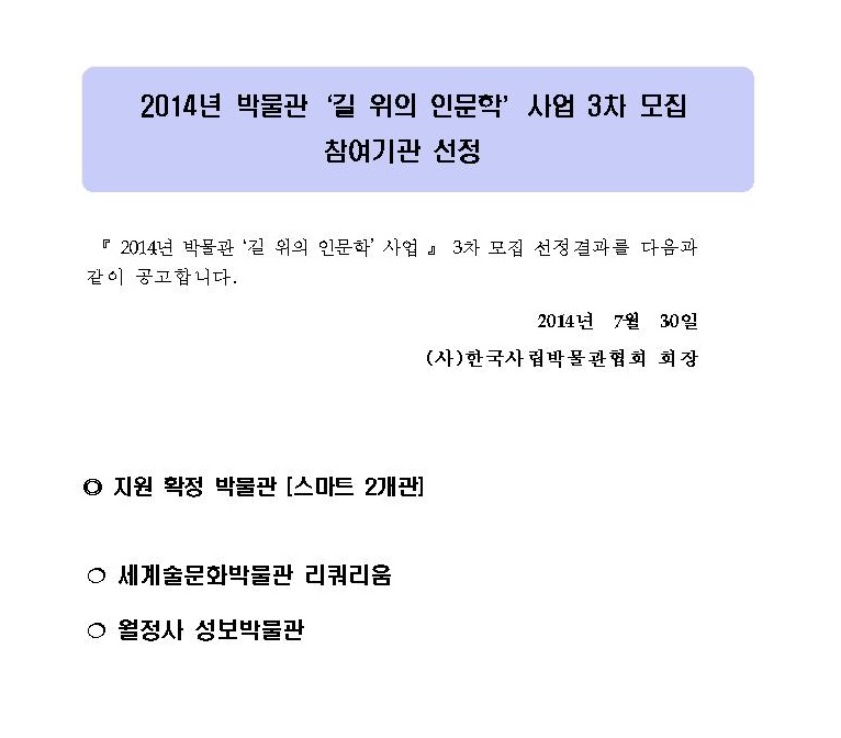 [인문학] 2014 박물관 길 위의 인문학 3차 기관모집 선정결과발표 페이지 정보 작성자 관리자 작성일14-07-30 14:31 조회39,386회 댓글0건 관련링크 이전글 다음글 목록 본문 댓글목록 등록된 댓글이 없습니다. 이전글 다음글 목록