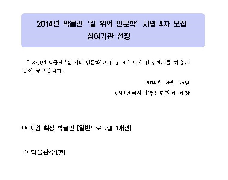 2014 박물관 길 위의 인문학 4차 기관모집 선정결과발표 페이지 정보 작성자 관리자 작성일14-08-29 14:33 조회40,185회 댓글0건 관련링크 이전글 다음글 목록 본문 댓글목록 등록된 댓글이 없습니다. 이전글 다음글 목록