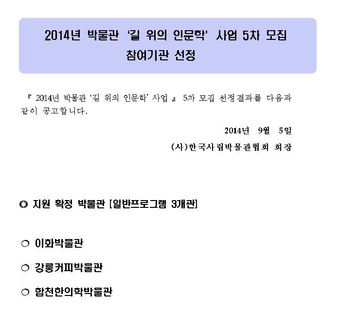 2014 박물관 길 위의 인문학 5차 기관모집 선정결과발표 페이지 정보 작성자 관리자 작성일14-09-05 14:34 조회40,483회 댓글0건 관련링크 이전글 다음글 목록 본문 댓글목록 등록된 댓글이 없습니다. 이전글 다음글 목록
